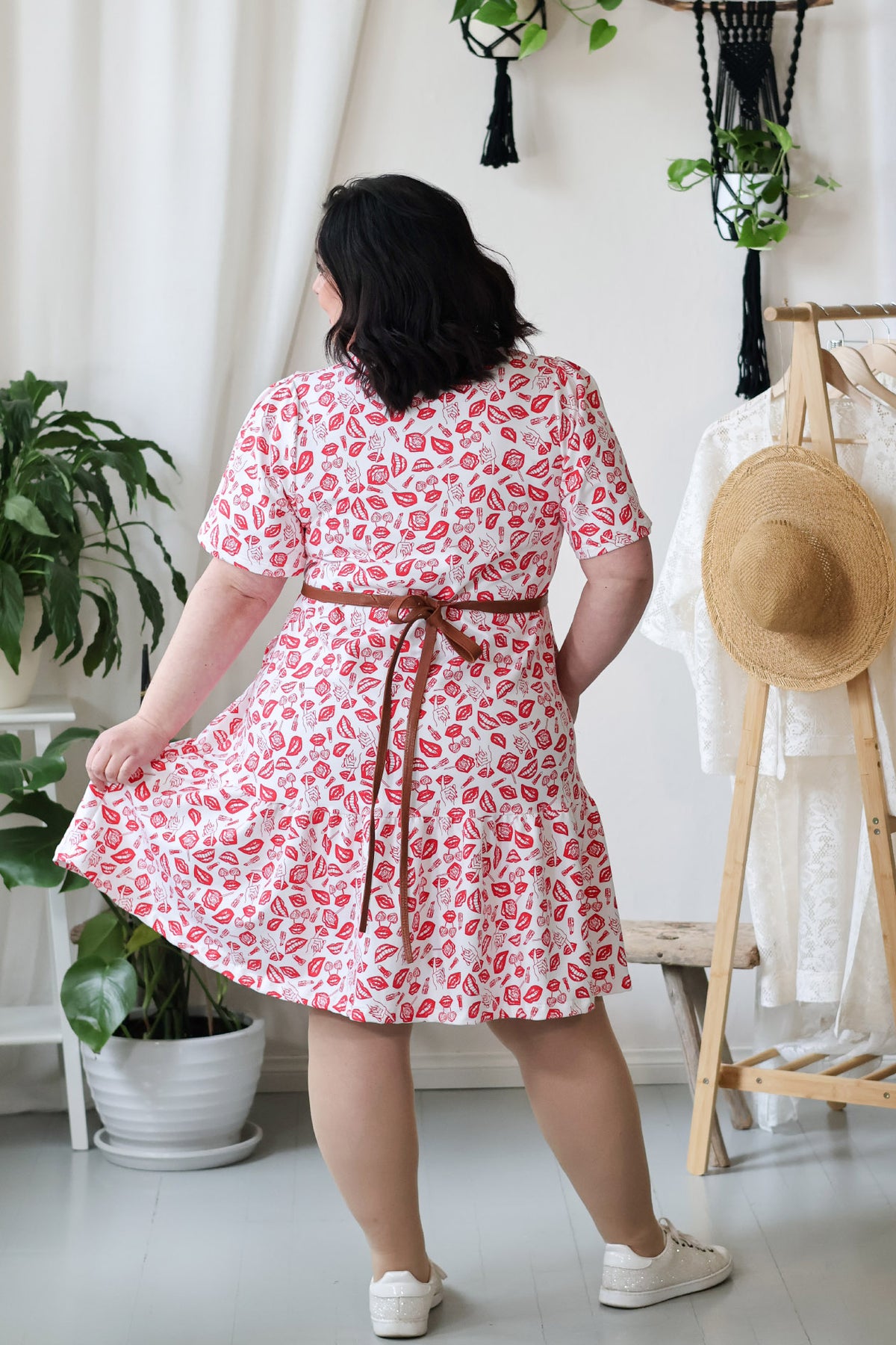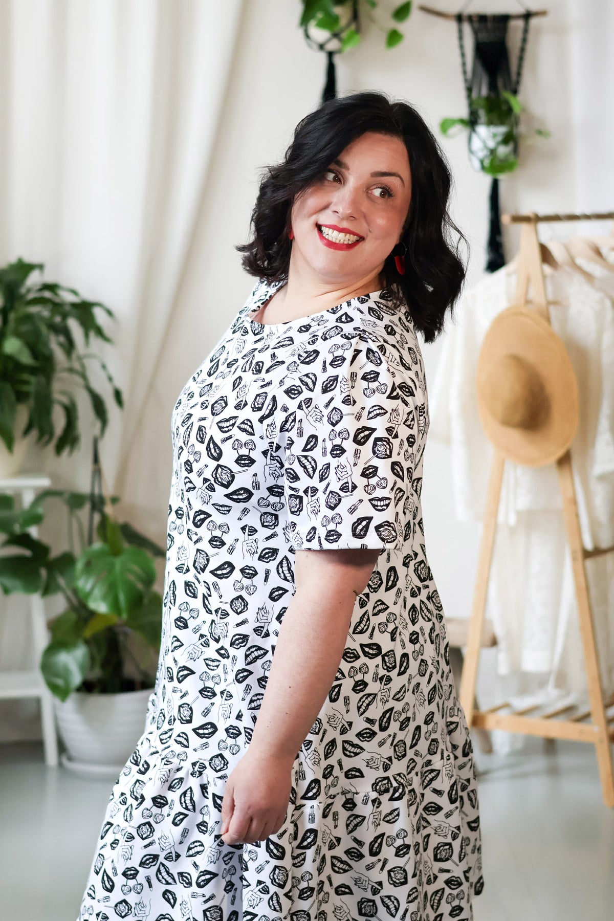 Aate clothingin tuotteet suunnitellaan Salossa, Mathildedalissa, jossa sijaitsee myös kivijalkamyymälä. Kuvassa Juni-mekko POP-kuosilla ja asustettuna Kiedon Siro-kietaisuvyöllä.