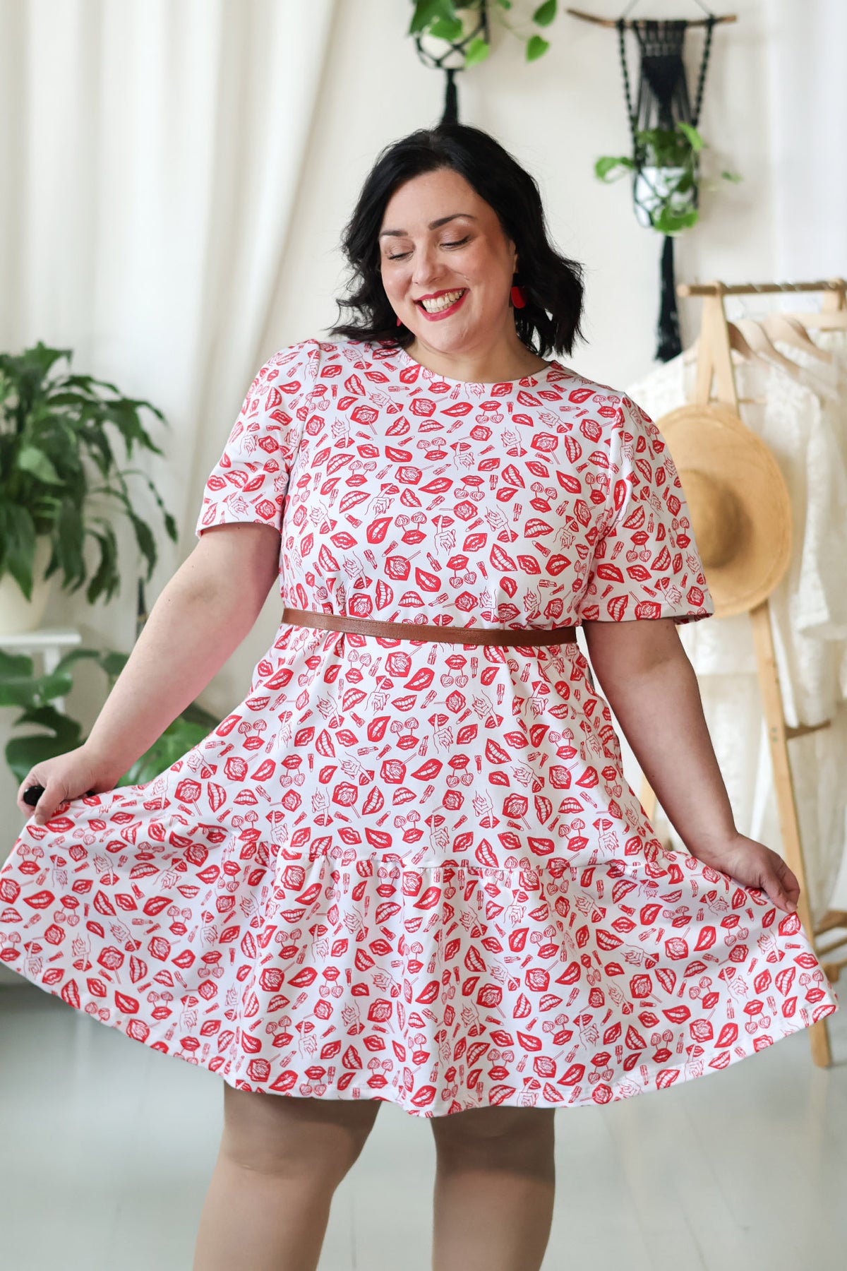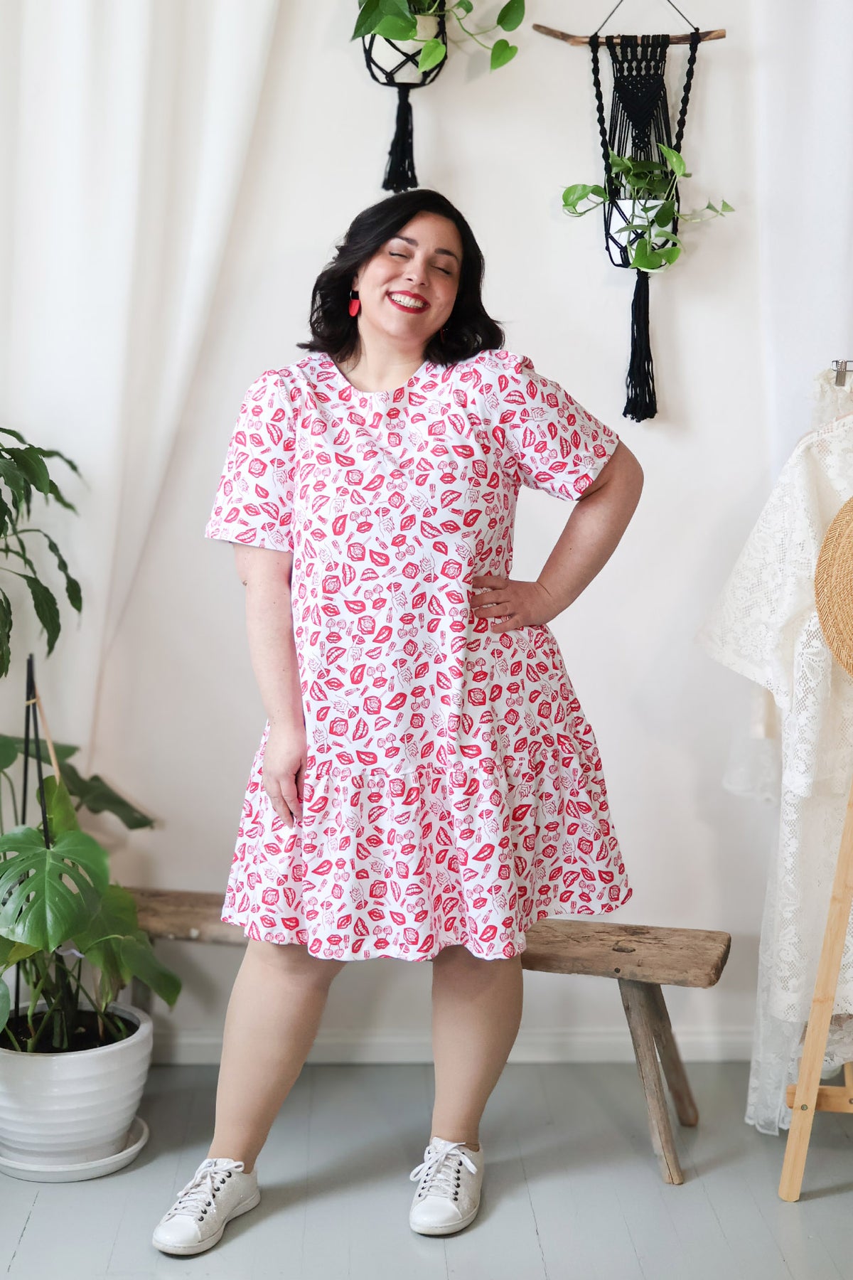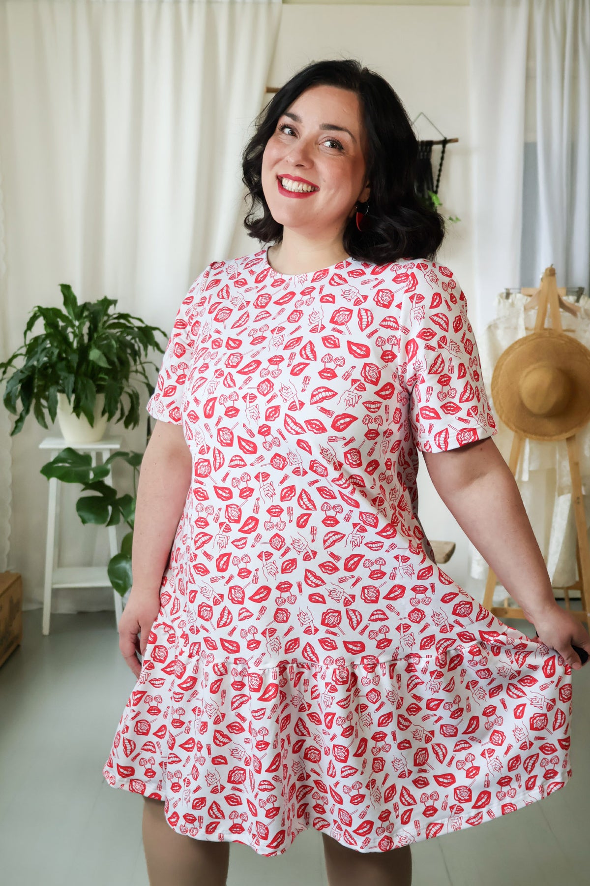 Juni-neulosmekko punaisella POP-kuosilla. Kuosin on suunnitellut Miina Launiainen ja se on painettu Printscorpiolla Pälkäneellä.