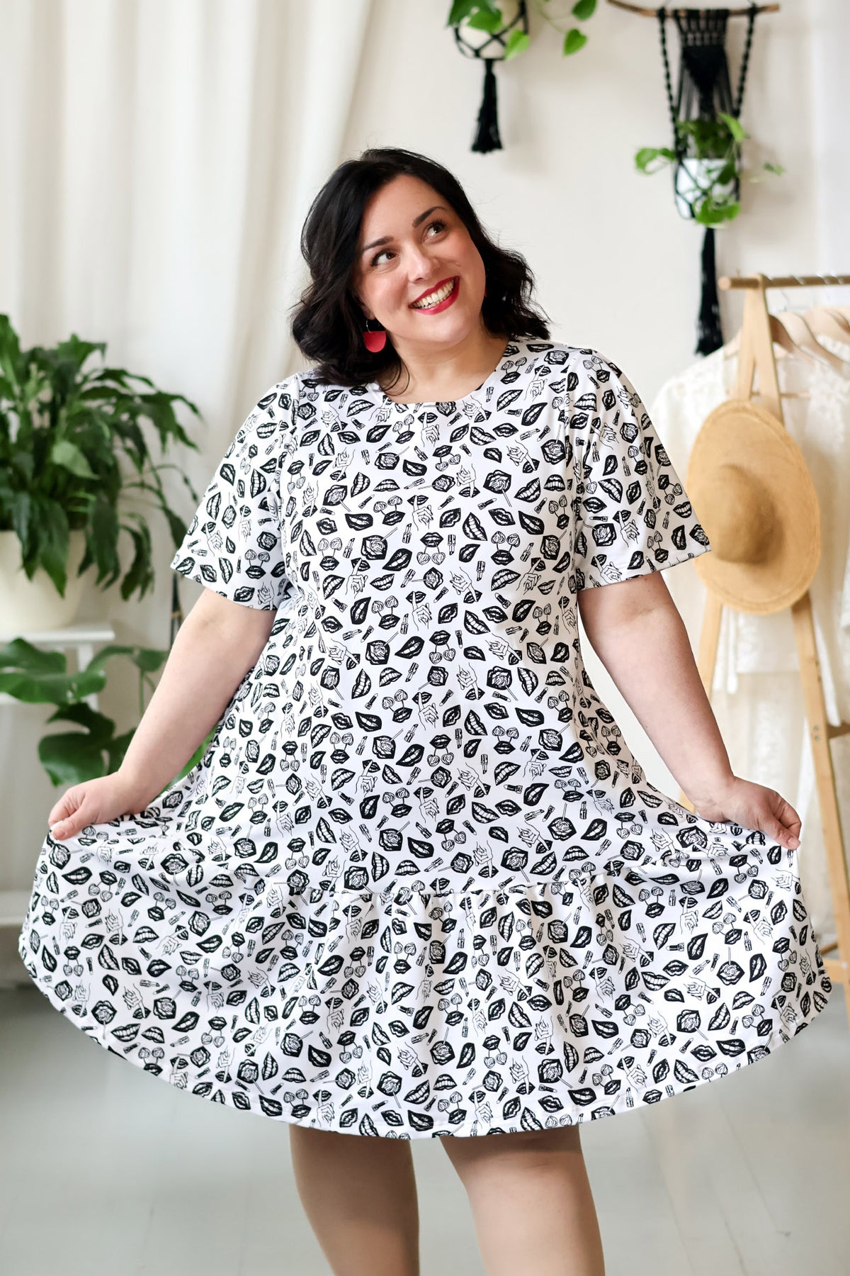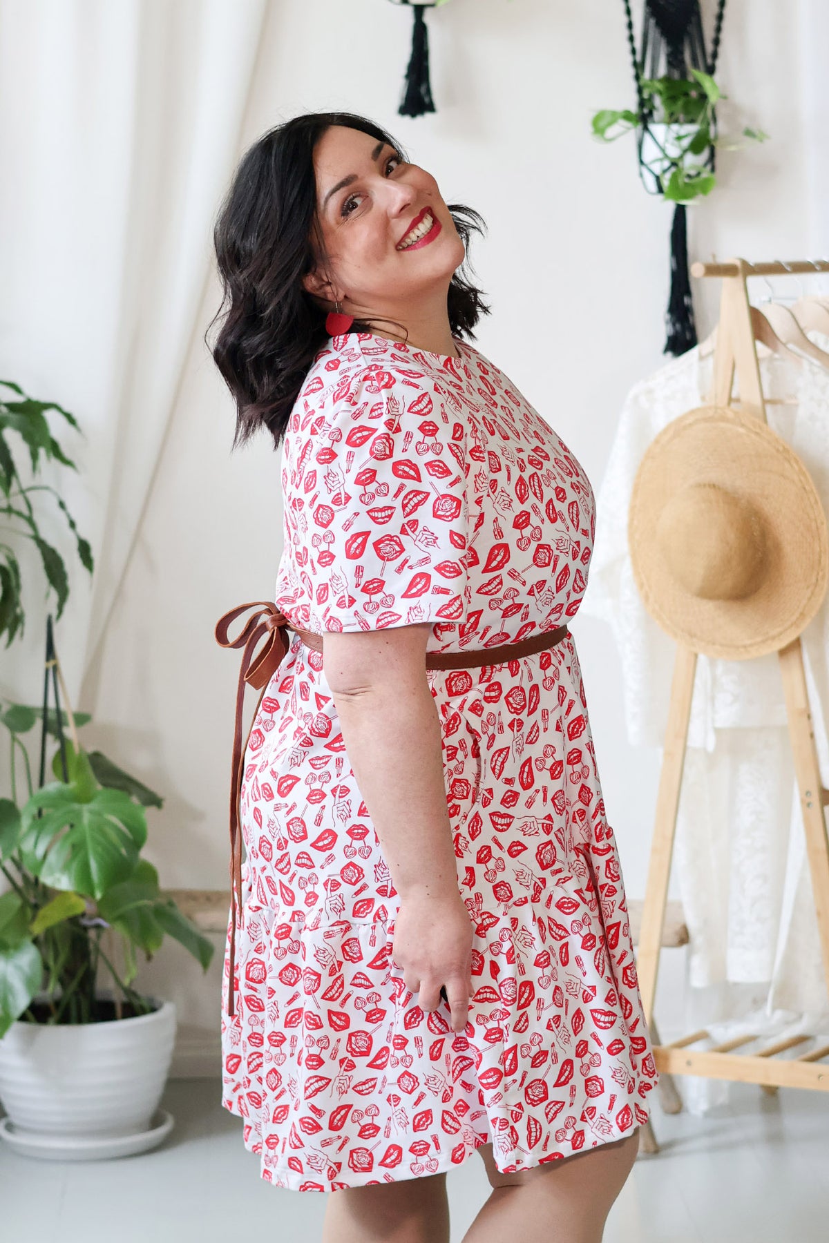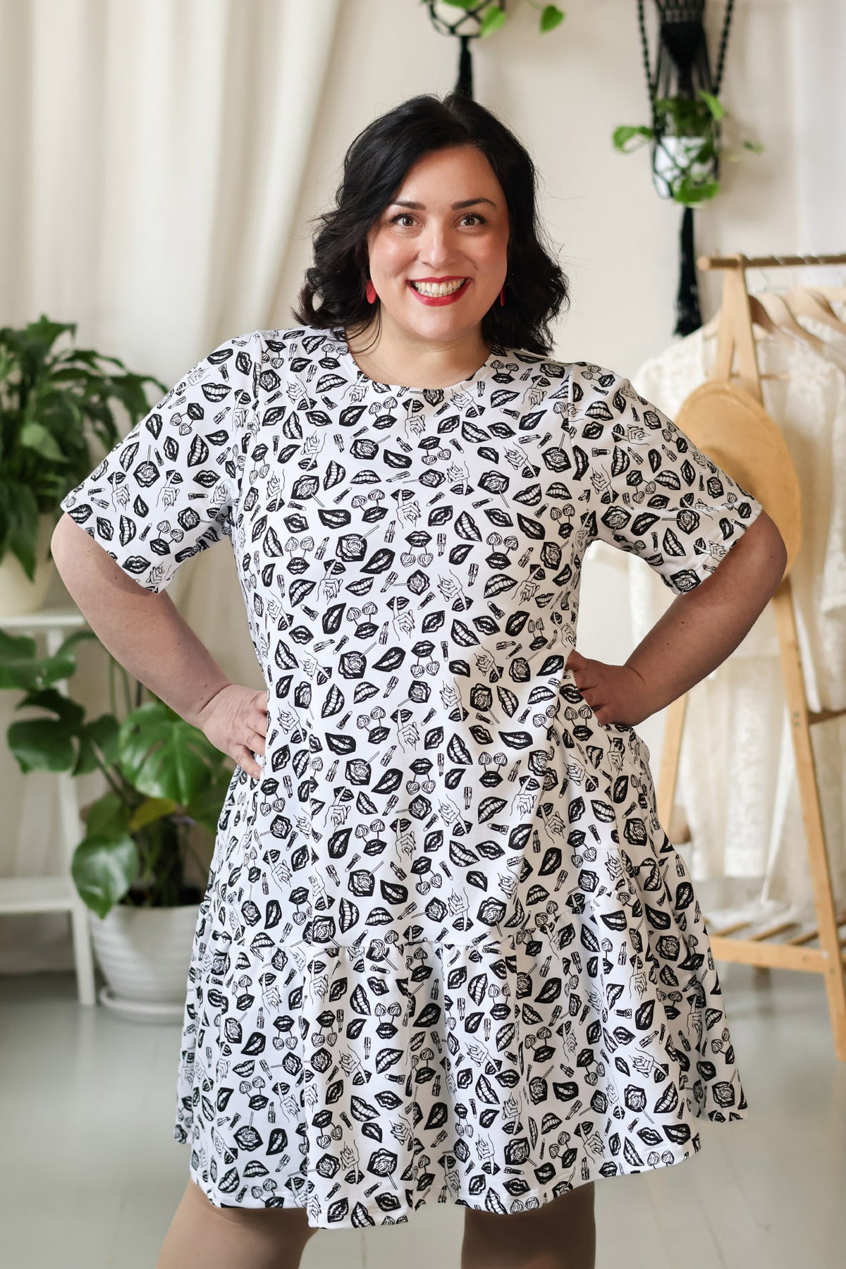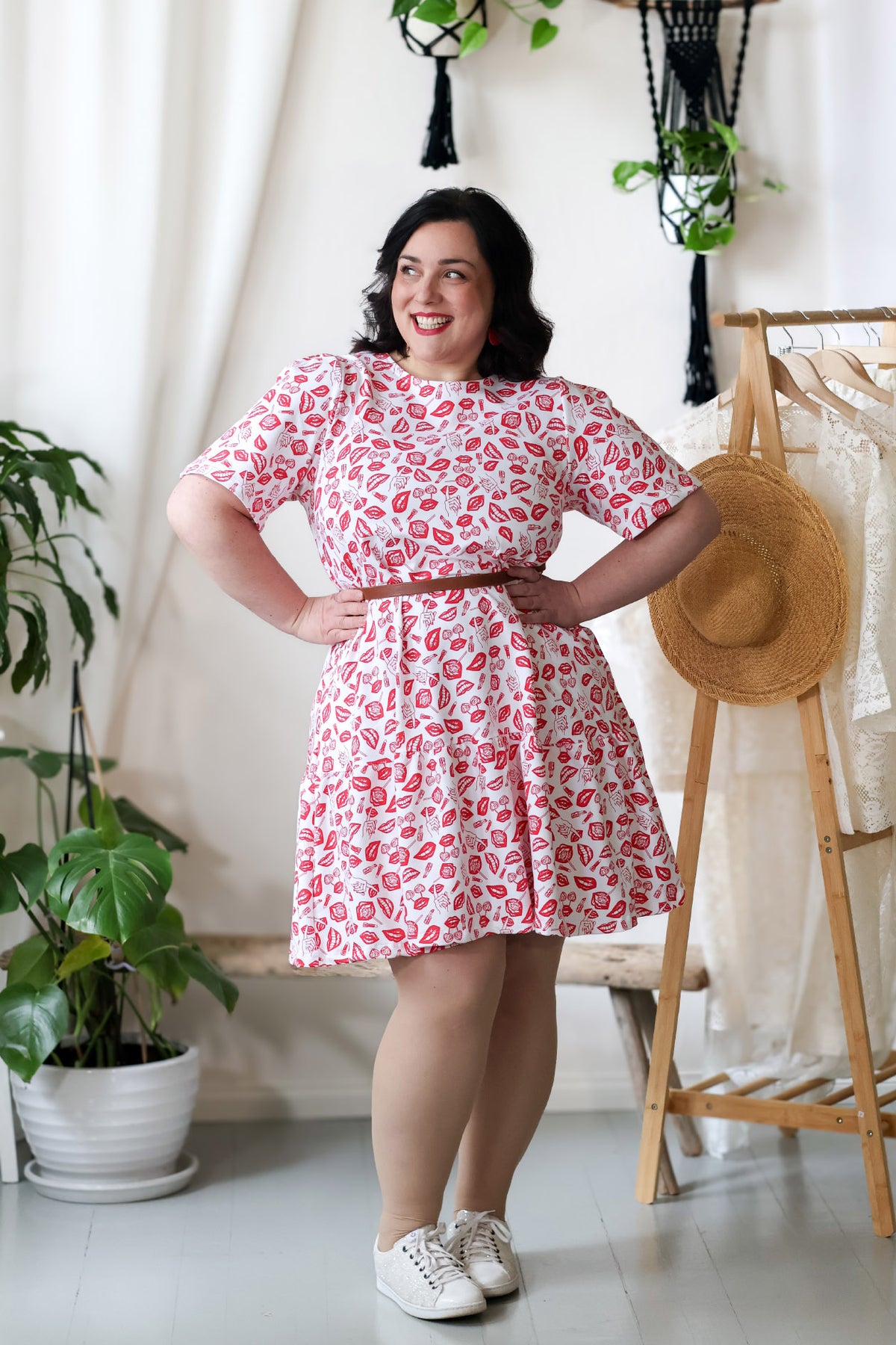 Juni-neulosmekko punaisella POP-kuosilla. Kuosin on suunnitellut Miina Launiainen ja se on painettu Printscorpiolla Pälkäneellä.