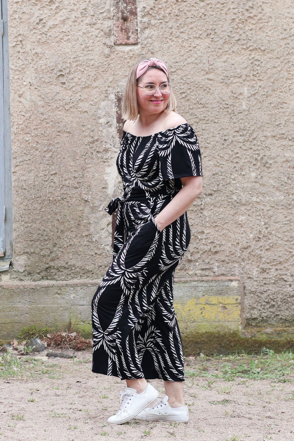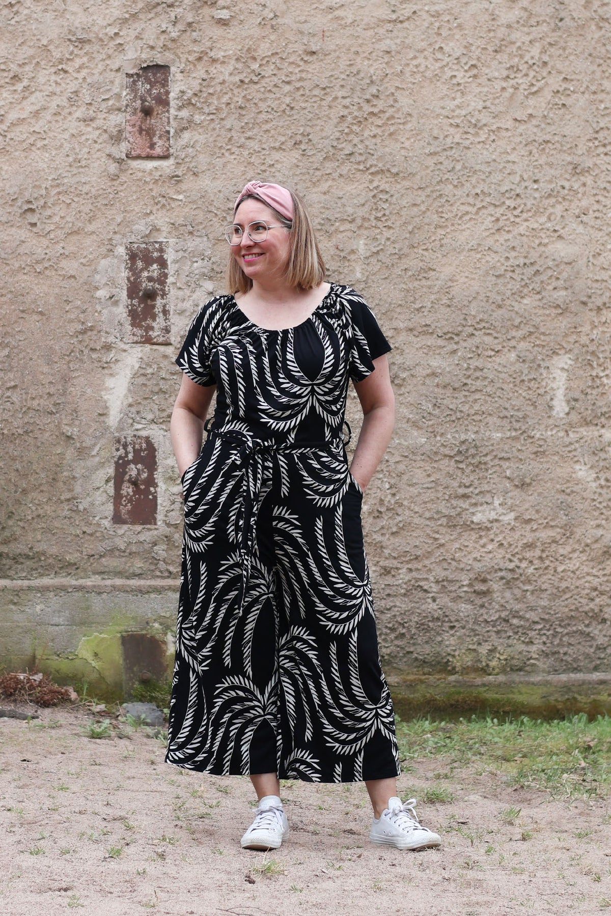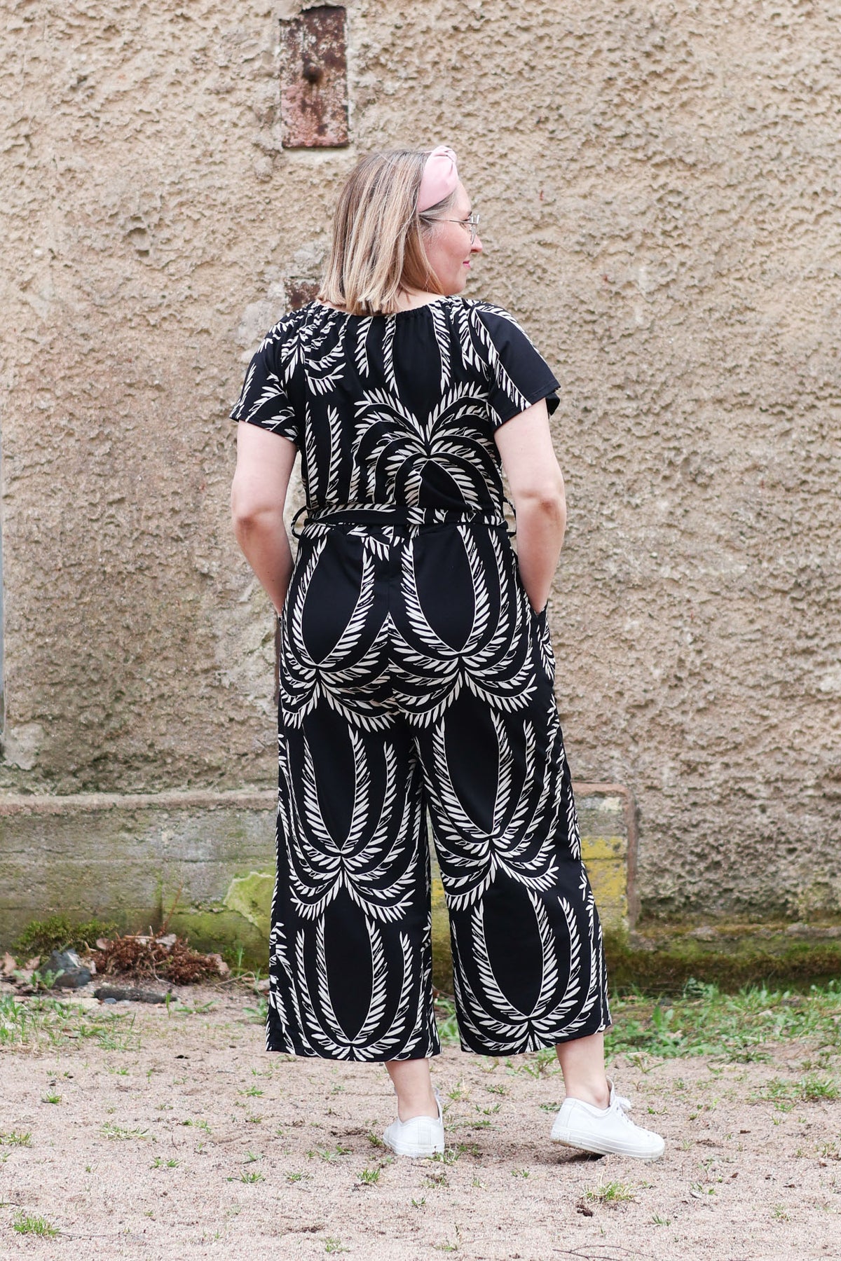 Mustavalkoinen Jasmine-neuloshaalari takaa,koossa M/L. Haalarissa on vajaamittaiset, leveät lahkeet.