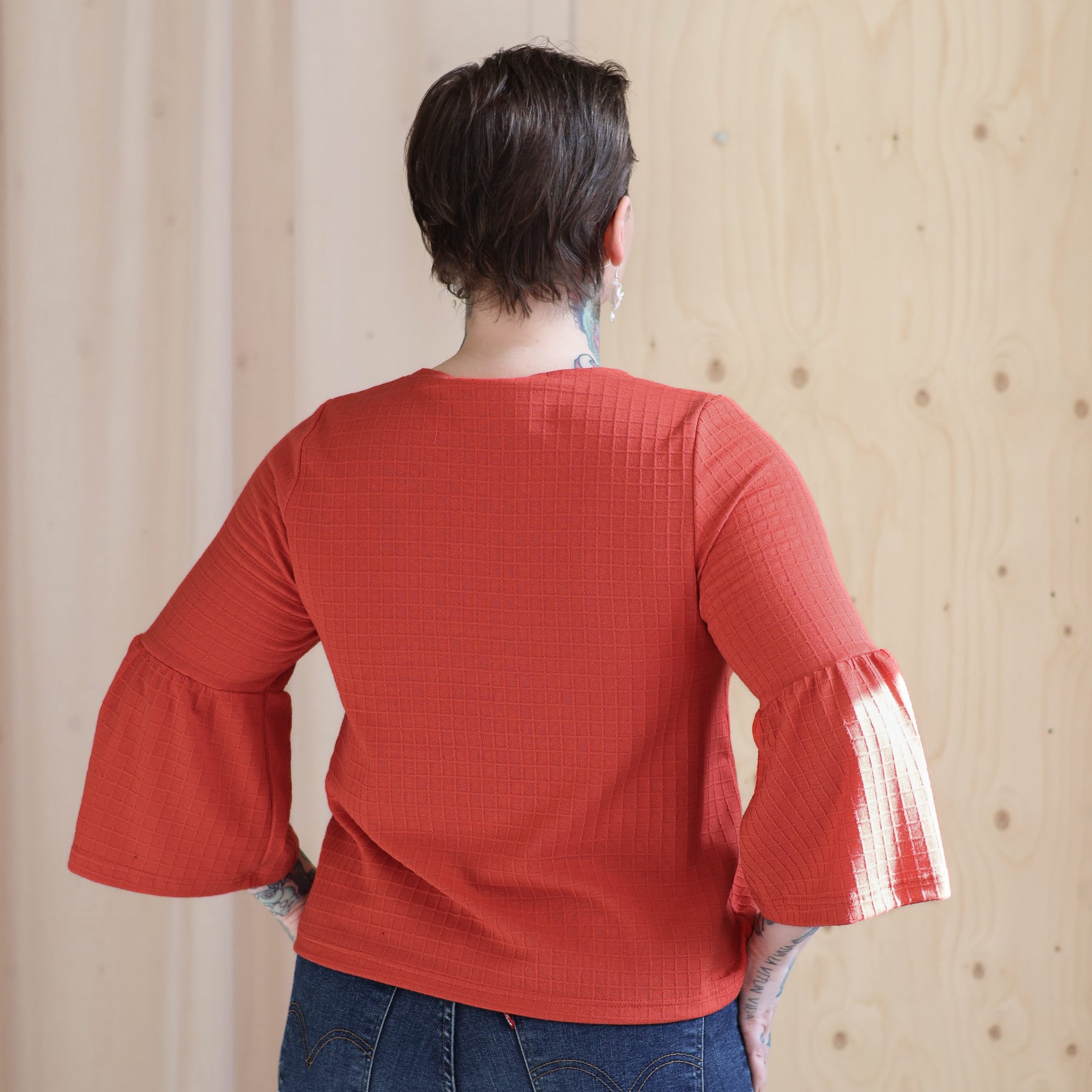 - Materiaalina on vähän paksumpi ja ryhdikäs puuvilla/modaali 50/50%, jossa on neulottu ruutukuviointi pinnassa.