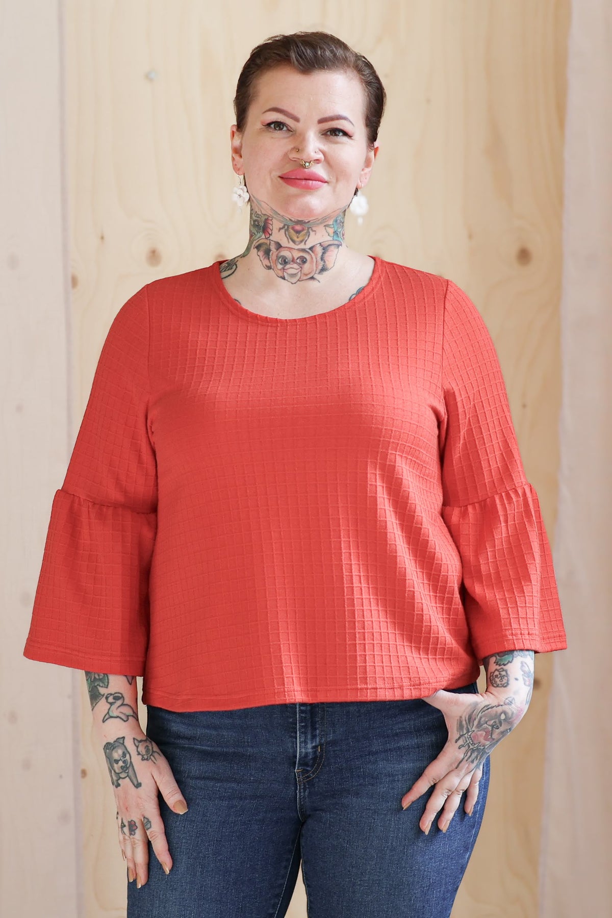 Täydellinen cropattu neulospusero, jossa pieni o-pääntie ja väljä suora malli. Muuten yksinkertaisessa paidassa on kaunis ja persoonallinen poimutettu hihansuu ja se tuo puseroon kivaa ilmettä. Pidä puseroa farkkujen kanssa tai neuleen sijaan mekkojen päällä.